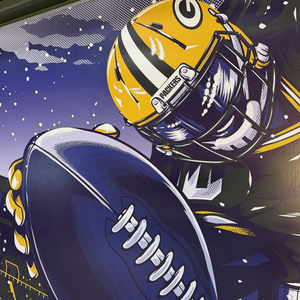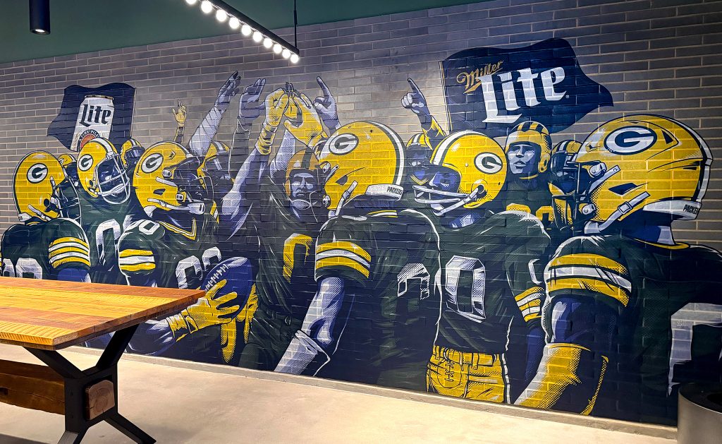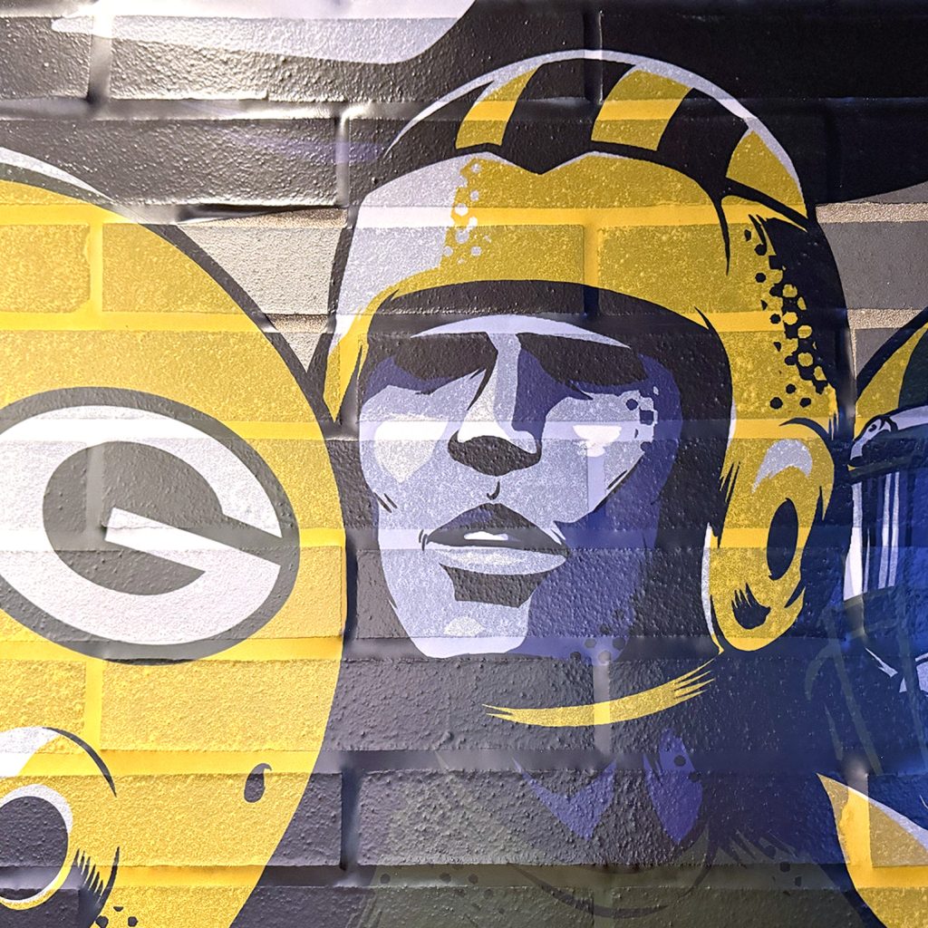 This mural depicts decades of winning culture at Lambeau field. 13 players represent the 13 NFL championships the team has won so far. Players from every era of Packers history are together as one team – with their hands all in. I even worked with a Green Bay Packers historian to ensure the classic uniforms and colors were authentic.